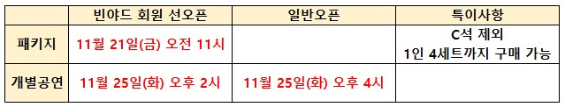 ※ 개별공연 판매준비를 위해 11.25(화) 13:00~13:59 까지 패키지 좌석지정이 중단됩니다.